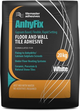 Tilemaster AnhyFix is a gypsum based, polymer modified, flexible rapid setting floor and wall tile adhesive. Tilemaster AnhyFix has been specially formulated for fixing a large variety of tiles such as ceramic, porcelain and natural stone to anhydrite/calcium sulphate screeds and gypsum based substrates such as gypsum plaster and plasterboard.
